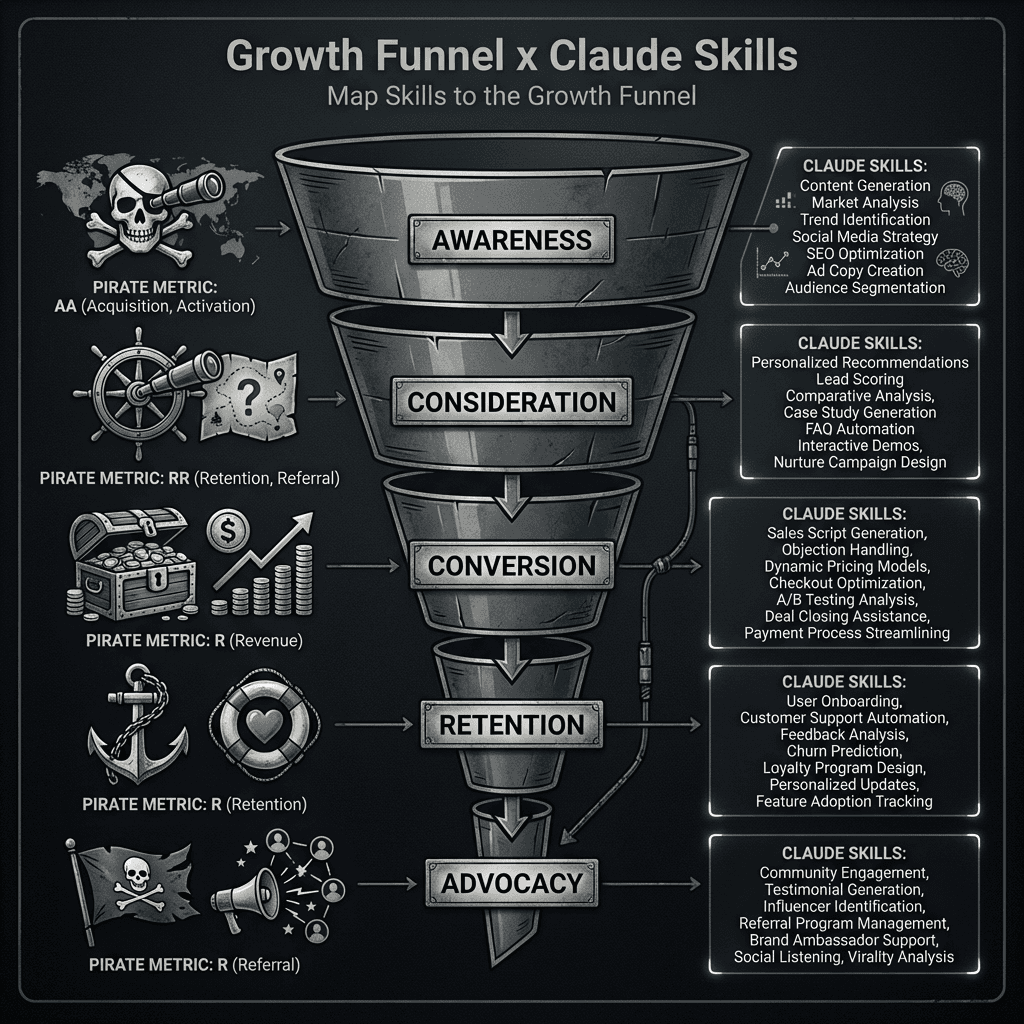 The most useful way to organize Claude skills for a growth team is by funnel stage: acquisition, activation, retention, expansion, and resurrection (AARRR, if you're nostalgic for Dave McClure's pirate metrics). Each stage has distinct jobs to be done, distinct metrics, and distinct skill requirements.