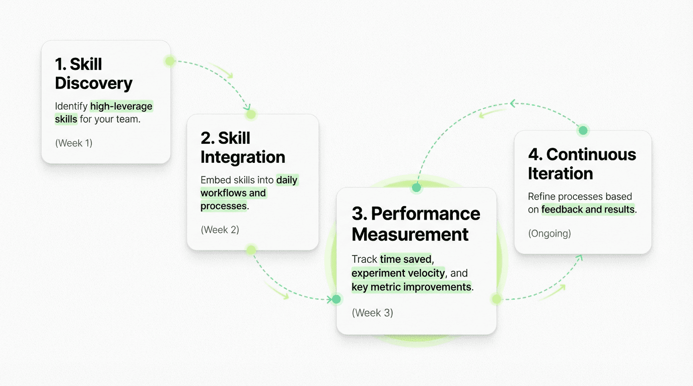 Clarity on ownership prevents skills from becoming shelfware. Assign each skill a primary owner, document when and how they should use it, and build it into their weekly operating rhythm. Skills should feel like power tools in a well-organized workshop, not random scripts scattered across Google Docs.