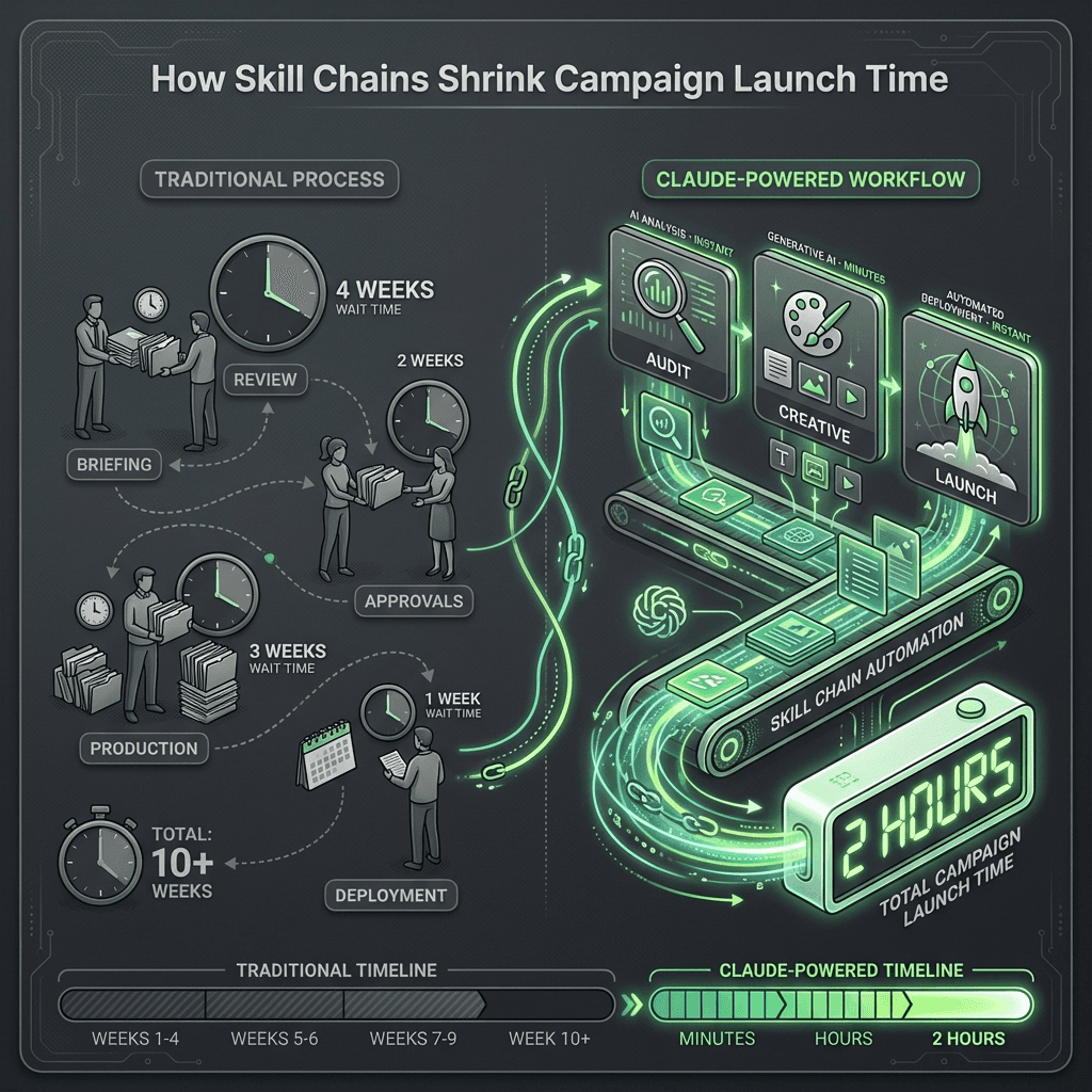 New Campaign Launch in Two Hours Instead of Two Days: Skill one audits competitor ads and landing pages. Skill two generates a positioning hypothesis and creative concepts. Skill three drafts ad copy and landing page variants. Skill four produces an experiment brief with success metrics and sample size requirements. The growth PM reviews, tweaks, and ships. Total elapsed time: two hours. Traditional process: two days of meetings, briefs, and back-and-forth with copywriters and designers. These types of ai powered marketing automation workflows are now becoming standard in advanced teams.