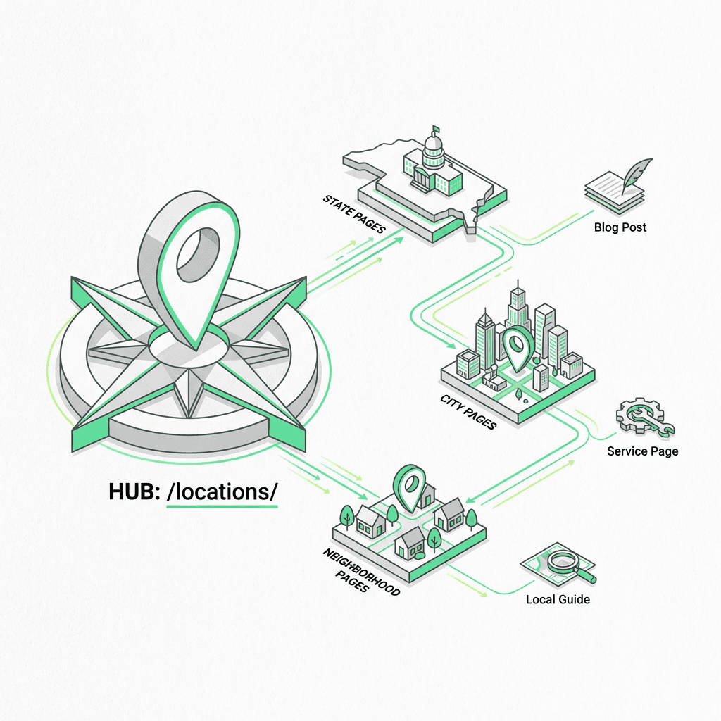 Structure location pages with logical hierarchy using URL paths like /locations/state/city/ that create clear context for crawlers and users. Each level should serve a purpose—state hubs can aggregate city pages, while city pages list specific service areas or neighborhoods. Implement strategic internal linking connecting location pages to main service offerings bidirectionally, related locations like nearby cities, your Google Business Profile, and relevant regional blog content to create a semantic web search engines can understand.