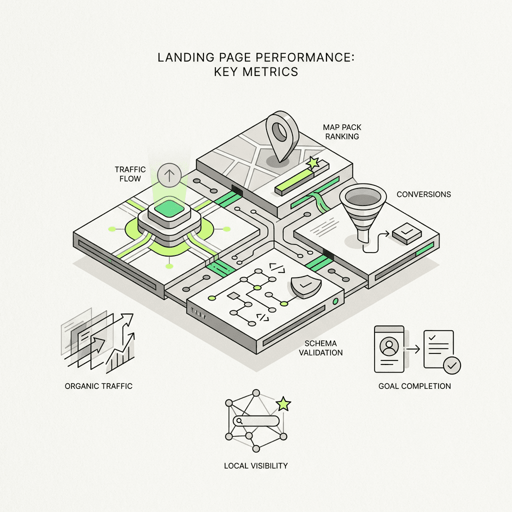 Track organic traffic per individual location page, not just overall traffic, along with map pack rankings for city-plus-service keyword combinations. Monitor click-through rates from search results, conversion rates including calls and form fills, and engagement metrics like time on site and scroll depth. Set up location-specific conversion tracking in Google Analytics and Search Console, and regularly validate schema implementation status to ensure your structured data parses without errors or warnings.