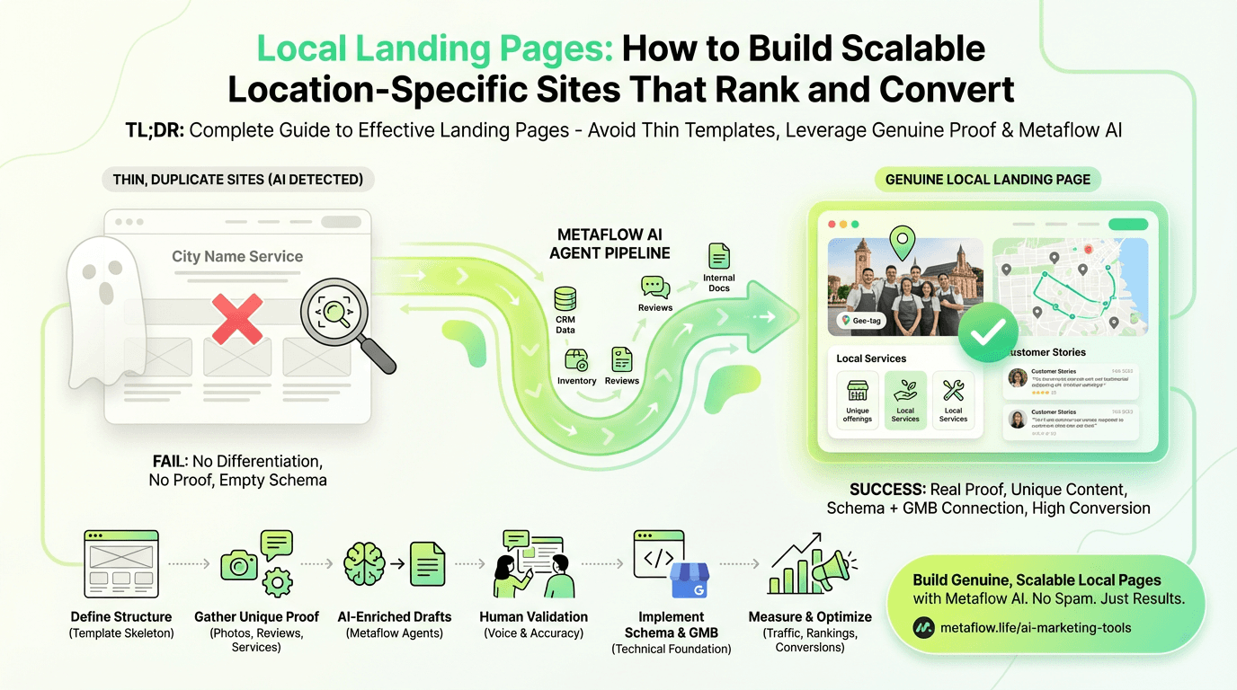 Metaflow AI offers a third path: an automation platform that generates landing page drafts enriched with real per-location information.