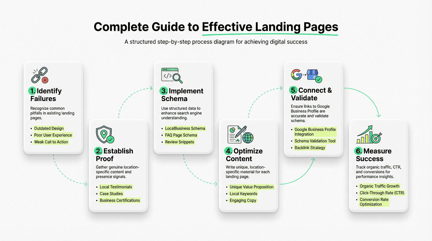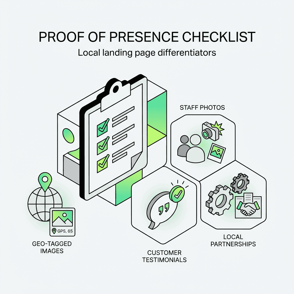 • Effective landing pages require real proof: staff photos, location-specific services, customer stories, geo-tagged images, and tangible presence signals