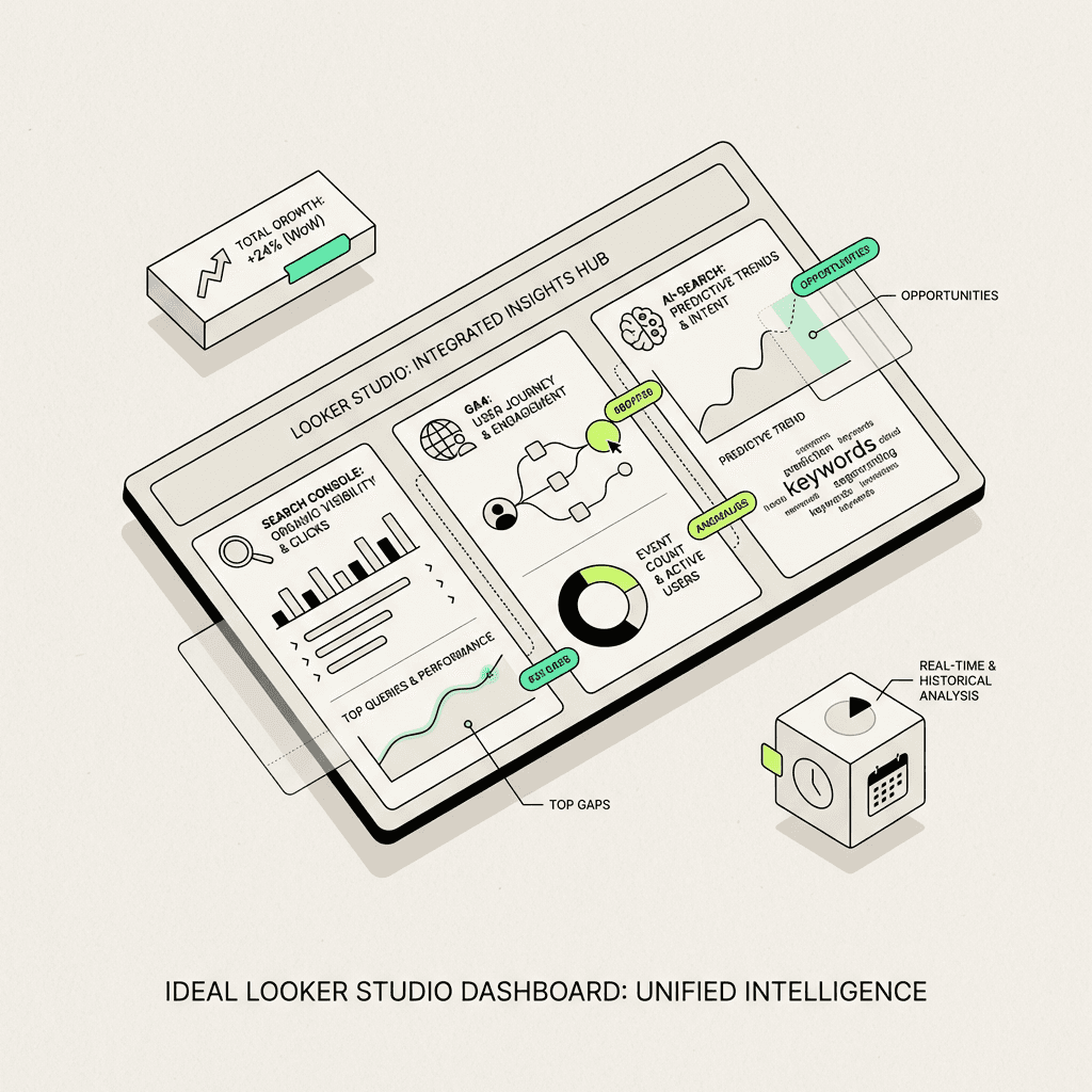 Now that your data sources are connected and you understand their quirks, it's time to create a Looker Studio SEO dashboard that unifies everything into a single view. Looker Studio (formerly Google Data Studio) is free, flexible, and integrates natively with Search Console, GA4, and dozens of other data sources.